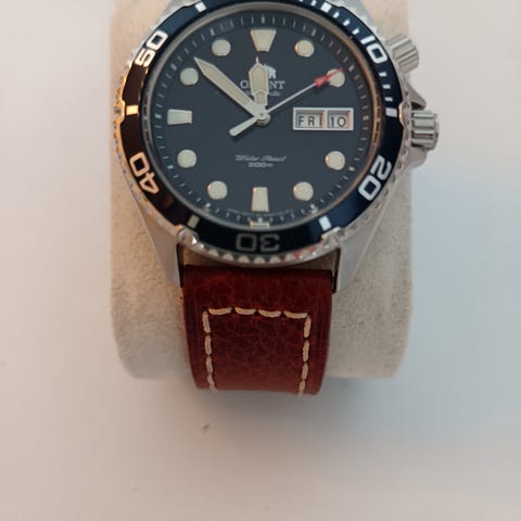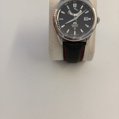 Kellotaulun väri valkoinen. Leveys 41 mm (Ilman nuppia). Näyttää päivämäärän ja viikonpäivän. Orientin oma automaattikoneisto, joka näkyy kellon takakannen lasin läpi. Kellossa kiinni aito Hirschin musta kuvioitu nahkainen ranneke punaisin tikkauksin.
