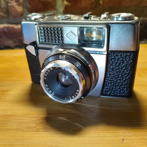 In 1946 the camera was redesigned, getting away from average box camera design[1]. Then the inner part of the camera was fixed to the side panel with the film winding knob. The whole unit could be pulled out of the camera sideways after unlocking it with the knob on the other side panel. Focusing was possible by pulling the lens out for close exposures. Pictures were 6×6cm on 120 film. An old Barnet-Ensign Ful-Vue may need some manipulation by simply bending the long metal strip that is part of the roll-holder a little bit to achieve the necessary tension of the film.