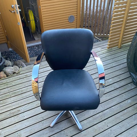 Kampaamosta asiakastuoli. Putsattu ja ollut sisäkäytössä. Säilytetty tilan puutteessa hetken parvekkeella, mutta säältä suojassa, joten hyvässä kunnossa. Jotain vikaa jalan nostomekanismissa, joten kantaessa valahtaa alas, mutta käytössä toimii ja pysyy ylöspumpattuna.