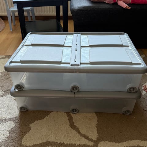 Materiaali on valkoiseksi maalattua puupohjaista levyä. Sopii esimerkiksi lastenhuoneen lelujen, kirjojen tai muiden tavaroiden säilytykseen sekä istuimeksi tai matalaksi pöydäksi.