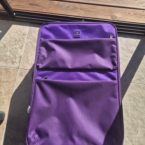 Samsonite matkalaukku, jossa. Sisäpuolella kiristysremmit pitävät sisällön paikoillaan. Laukussa on sivukahva kantamista varten sekä pyörät helpottamaan kuljettamista. Väri tummasävyinen. Soveltuu yleiseen matkakäyttöön. Pari pientä kauneusvirhettä, muutoin toimiva.