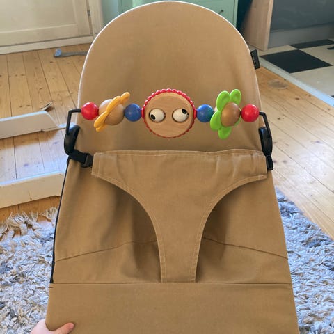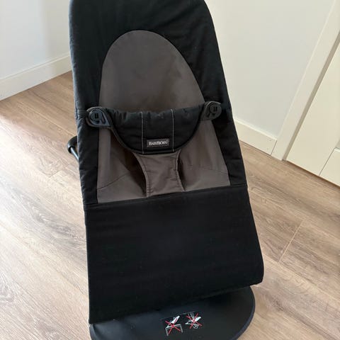 Babybjörn sitteri. Tuolissa on pehmeä kangasistuin ja irrotettava lelukaaren kaltainen leluosa, jossa on värikkäitä muovisia leluja lapsen viihdyttämiseen. Sopii pienille lapsille rentoon istumiseen ja lepäämiseen kotikäytössä. Kunto hyvä käytetty.