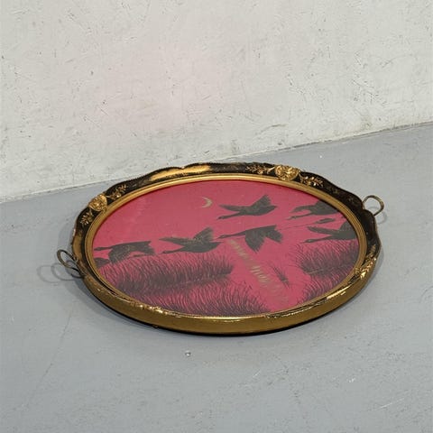 Pyöreä rokokoo henkinen koristeellinen tarjotin, jossa on koristeelliset reunat ja kahvat. Keskellä on kuviointi, jossa on lintuja ja kuunsirppi punaisella taustalla.