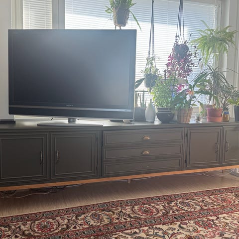 Kaunis senkki, mutta ei löydä meiltä muuton jälkeen paikkaa. Ovet ja laatikon saa lukkoon kahdella eri avaimella, jotka ovat tallessa. Kannessa hieman kulumaa (kuvissa). Halkeamat keskiovessa, näitä edellinen omistaja paikannut.