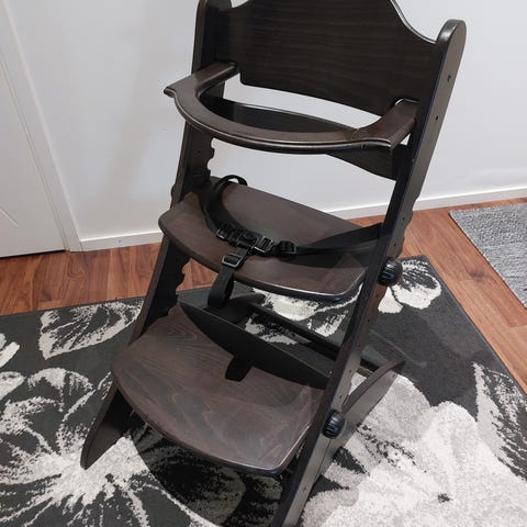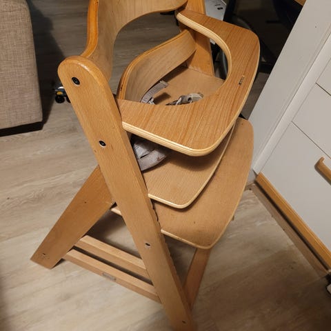 Hauck syöttötuoli, jossa puinen runko ja muovinen harmaa tarjotinosa. Tuolissa on jalkatuki ja istuinosa lapselle. Tarjotin on irrotettava ja helppo puhdistaa. Soveltuu lapsen ruokailuun ja istumiseen pöydän ääressä.