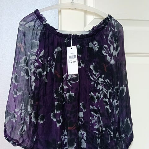 Todella laadukas T-paita jämäkkää neulosta, 85 % silkkiä. Ei nyppyynny eikä saumat kierry, laskeutuu kauniisti. Väri beige-punainen. Kokomerkintä S, mutta menee myös M-koolle. Kainalo-kainalo 42 cm, olka-helma 55 cm.