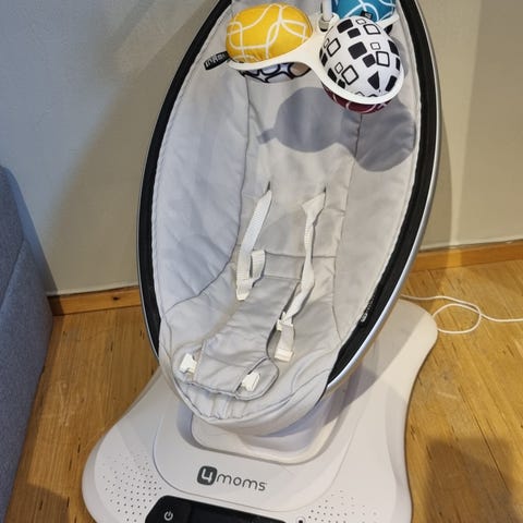 4moms mamaRoo sitteri. Sitterissä on musta istuinosa ja valkoinen jalusta. Laitteessa on valjaat lapsen kiinnittämistä varten sekä sähköinen jalusta, joka tuottaa keinuvaa liikettä. Soveltuu pienille lapsille valvottuun oleskeluun ja lepäämiseen sisätiloissa.