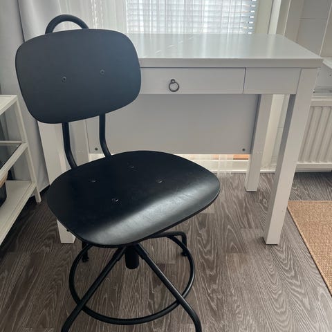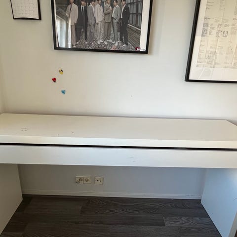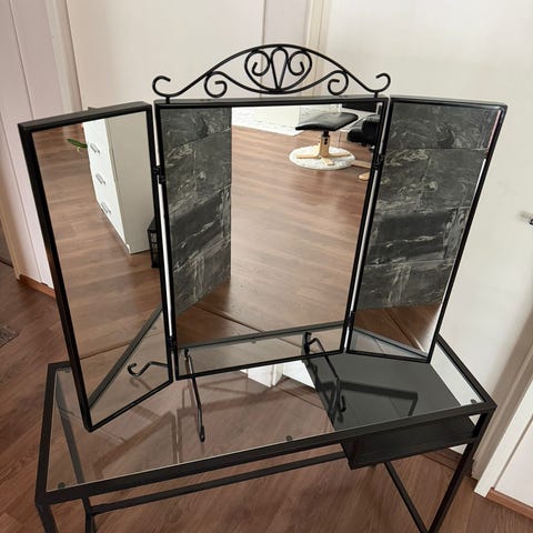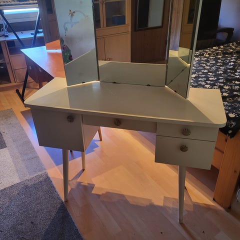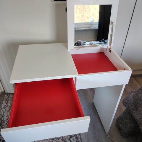 Ikean meikkipöytä jossa pieniä jälkiä, näkyy kuvassa.