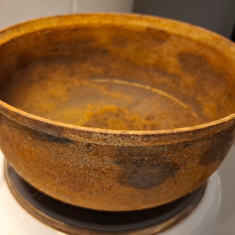 Isohko, vanha, painava valurautapata kukkapadaksi. Pohjassa halkeama. Koko: halkaisija 65cm ja syvyyttä 40cm. Nouto Pertunmaa Mansikkamäki.