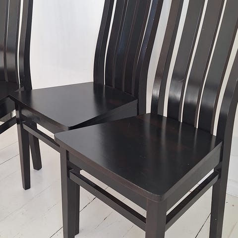 Kuusi kappaletta mustaa ruokapöydän tuolia. Käytön jälkiä löytyy ja ruuveja tarvitsee kiristellä. Muuten ihan istuttavat mukavat tuolit. Alunperin Vekestä, mutta ei ole enää valikoimassa.