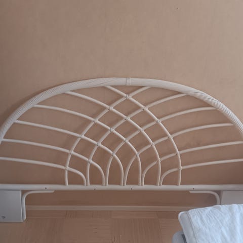 Puukehyksinen, kaareva pääty, jossa punottu rottinkipinta. Muutama punos katkennut (kuvat) ja jonkun verran ajan tuomaa kulumaa. Yleisilme kuitenkin siisti. Viimeisessä kuvassa näkyy kokoa 120cm leveän ja 60cm korkean sängyn takana.