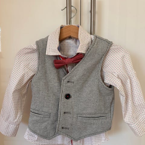 Siisti kerran käytetty juhlapuku pienelle miehelle. Vaaleansininen kauluspaita, beiget housut ja tummansininen rusetti. Merkki H&M ja koko 80.