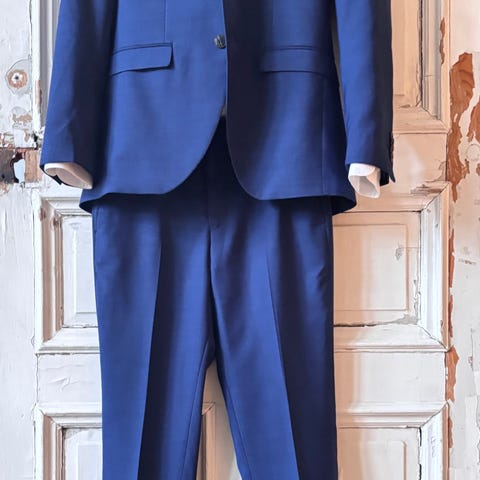 Jack & Jones puku hoikalle miehille, koko 46. Sininen kaksiosainen setti, jossa on pikkutakki ja suorat housut. Materiaali on polyesteriä. Oli pojan (noin 176cm) omissa yo-juhlissa. Pikkutakissa kaksi nappia edessä ja takahalkio, housuissa perinteinen vyötärö ja taskut edessä sekä takana.