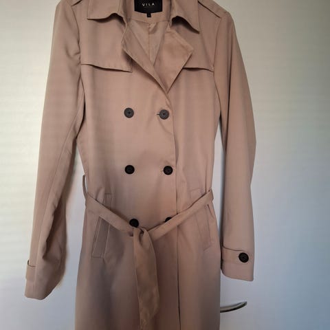 Vila trenssitakki naisille. Koko S. Väri beige. Materiaali polyesteri, viskoosi, elastaani. Takissa on nappikiinnitys edessä, sivutaskut ja vuoritus. Kauniisti kellotettu/alaspäin levenevä malli. Pituus 85cm