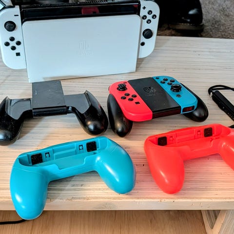 Nintendo Switch OLED -pelikonsoli valkoisilla Joy-Con-ohjaimilla. Konsolissa on OLED-näyttö, joka soveltuu käsikonsoli- ja pöytäpelitilaan. Mukana telakka TV-tilaa varten, Joy-Con-ohjaimet, Joy-Con-rannetutit sekä ohjainpidike. Kuvissa näkyy myös kantokotelo, joka suojaa konsolia kuljetuksen aikana. Soveltuu Nintendo Switch -peleille ja eri pelitiloihin: käsikonsoli, pöytätila ja TV-tila.