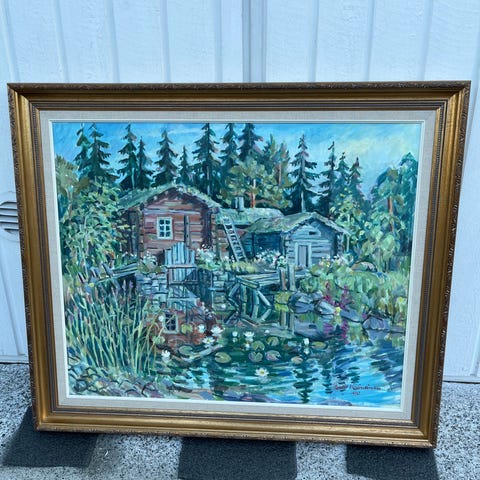 Iso R. Erälinnan öljymaalaus puro/ metsämaisema kehystetty