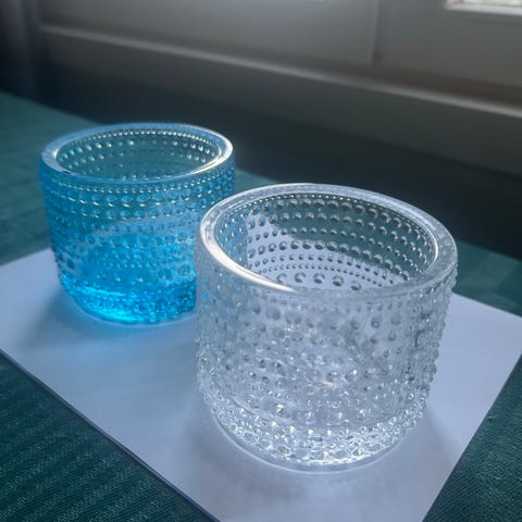 Kaksi hyvin vähällä käytöllä ollutta Kastehelmi-tuikkua. Sävyt sitruuna ja merensininen. Sitruunalle alkuperäinen pakkaus mukaan. Toisellekin tuo saattaa vielä kaapista löytyä, mutta en lupaa ihan vielä.