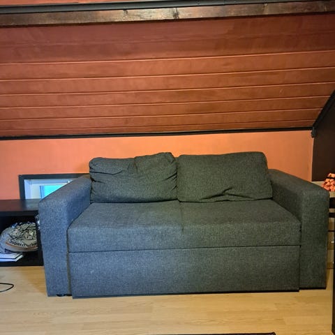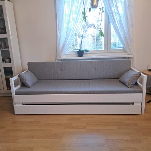 Patjat hyvässä kunnossa, käsinojissa pientä käytön jälkeä. Levitettynä 135cm.