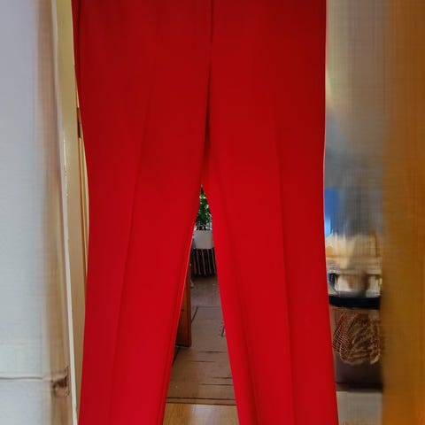 Mango naisten housut, koko 46. Väri punainen. Materiaali polyesteriä ja viskoosia. Housuissa vetoketjukiinnitys edessä. Lahkeen pituus sisäsauma n. 86cm. Olleet vähällä käytöllä.