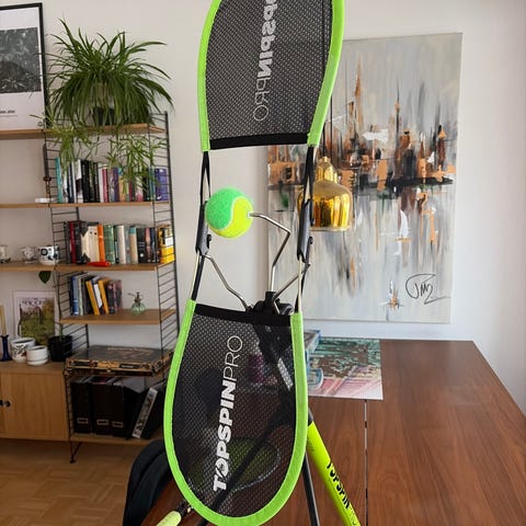 TopspinPro tennisharjoituslaite säädettävällä kolmijalkaisella jalustalla. Laitteessa on verkkomallinen iskulauta ja varteen kiinnitetty tennispallo, jonka avulla voi harjoitella tenniksen lyöntejä ja erityisesti kierteitä paikallaan. Korkeutta voi säätää eri pituisille pelaajille sopivaksi. Mukana vihreä TopspinPro-kantopussi säilytystä ja kuljettamista varten. Uusi vastaava n. 160eur. Löytyy Kangasalta ja kulkeutuu tarvittaessa Tampereelle.