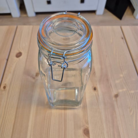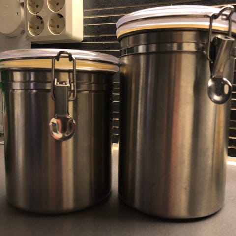 Lasinen säilytyspurkkisetti, jossa kaksi erikokoista purkkia. Purkit ovat läpinäkyvää lasia ja niissä on metalliset, todennäköisesti ruostumattomasta teräksestä valmistetut kannet. Sopivat esimerkiksi kuivatuotteiden, kuten pastan, riisin tai kahvin säilytykseen keittiössä. Helppo pitää puhtaana ja lasin läpi näkee sisällön määrän.