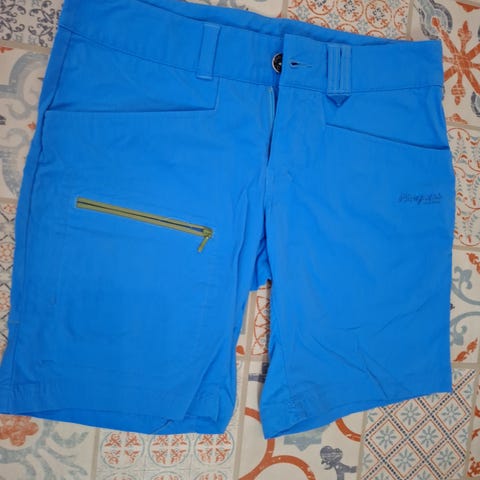 Kevyet, hieman pidemmät shortsit. Nopeasti kuivuvaa materiaalia (polyamidi ja elastaani). Molemmilla reisillä vetoketjutaskut. Edessä myös avotaskut. Vyölenkit. Tummansiniset.