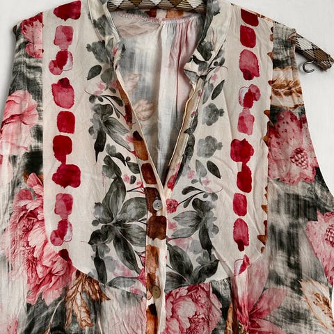 Ihana kesämekko naisille, koko XL. Materiaalina viskoosi. Mekossa on monivärinen, kirjava kuosi punaisen ja vaaleanpunaisen sävyissä. Malli on väljä ja polvipituinen tai hieman polven yläpuolelle ulottuva. Edessä on napitus yläosasta helmaan. Hihat ovat pitkät tai 3/4-pituiset ja hieman levenevät. Sopii kesäkäyttöön arkeen ja vapaa-aikaan, täydellinen kevään ja kesän juhliin. Merkki Ze-Ze, eikä & other stories (merkkiä ei löytynyt valikosta)