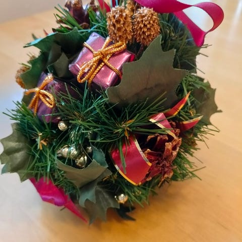 Ripustettava punainen erikokoista helmistä koottu pallo, halkaisija noin 7 cm.