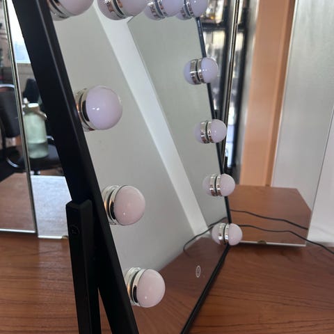Suorakaiteen muotoinen pöytäpeili, jonka kehyksessä on useita kiinteitä valopisteitä. Valot toimivat verkkovirralla.
