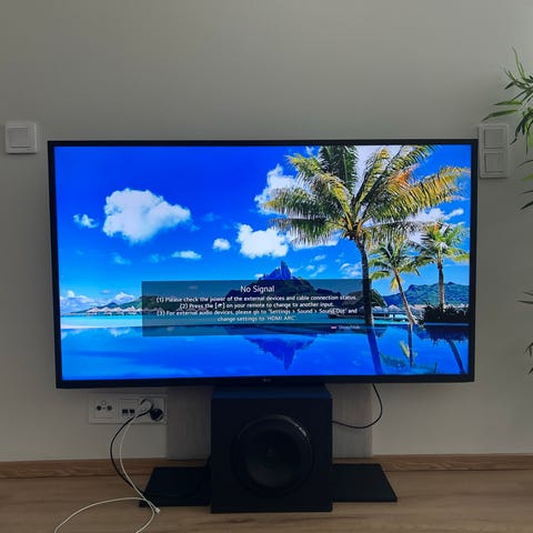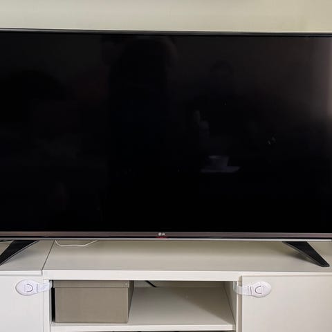LG TV in good condition. Purchased early 2020, manufactured 01.2020 according to the sticker on the back. Original box kept. The only issue is that screws from the bottom of the bracket were lost. TV is able to stand without them, because the weight of the TV presses down on the bracket, but if you want to make it harder to topple over - better to get new screws.