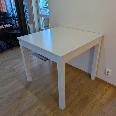 Itse maalattu valkoinen pöydän pinta. Hieman epätasainen ja käytön jälkiä näkyvissä, mutta helppo korjata maalilla!✨ Muuten täysin kunnossa.