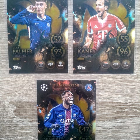 Panini FIFA 365 Legend -sarjan jalkapallokeräilykortit, joissa pelaajina Ferenc Puskás ja Michael Laudrup. Kuvissa korteissa pölyä, ei naarmuja. Kunto hyvä!