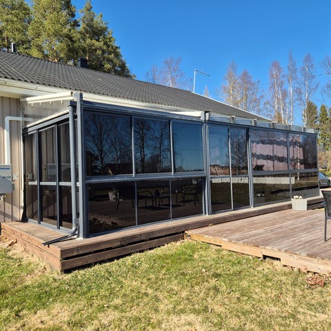Sivusta vedettävä markiisi. Mitat 90 * 300. Ollut pari kesää käytössä, nyt poistui kaihtimien tieltä. Kuvassa oleva tumma läikkä ei ole likaa, jokin varjostuma.