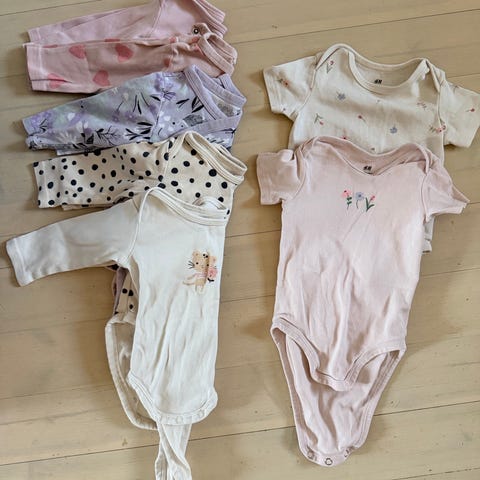 Sisältää 9 kpl housuja, yksi collagehaalari, 8 kpl pitkähihaisia bodyja, collagepaita, t-paita ja 4 kpl lyhythihaisia bodyja.