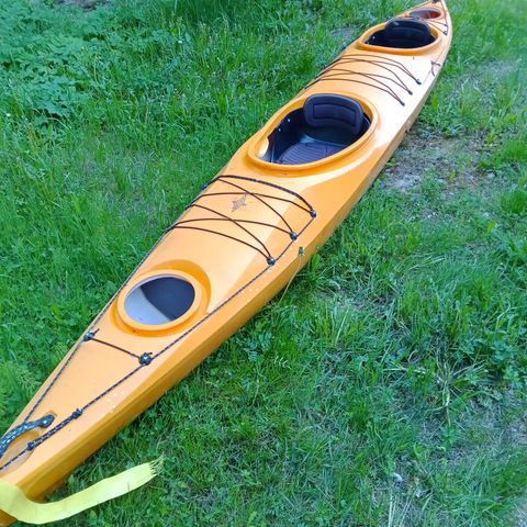 Star 630 kaksikkokajakki. Erikoismalli, joka on katkaistavissa keskeltä. Mukaan melat ja aukkopeitteet. Pohja pinnoitettu äskettäin topcoatilla. Kuvassa puuttuvat kansiköydet lisätään. Uuden hinta 3700 eur.