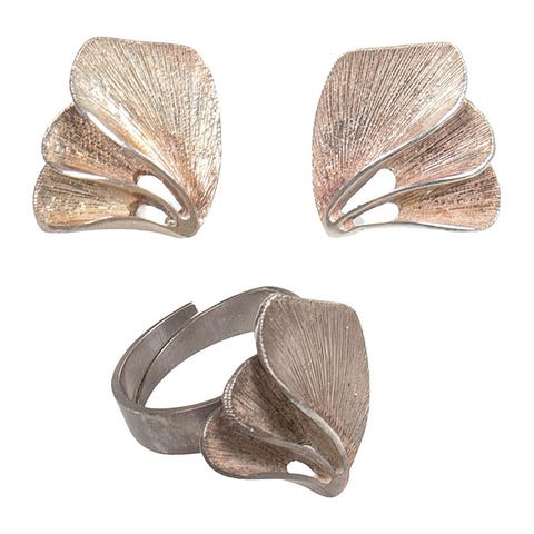 Valo-Korun valmistama korusetti sisältää sormuksen ja korvakorut, joissa on tyylitelty, viuhkamainen lehtiaihe. Korujen pinnassa on hienovarainen uurrekuviointi, ja sormuksessa on säädettävä avoin varsi. Materiaali on hopeaa, jossa on nähtävissä ajan tuomaa patinaa.Valmistaja: Valo-KoruKorvakorujen korkeus on noin 2 cmVäri: hopeaMateriaali: 925 hopea