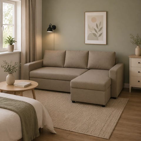 Divaaniosassa säilytyslaatikko. Divaanin puoli vaihdettavissa.