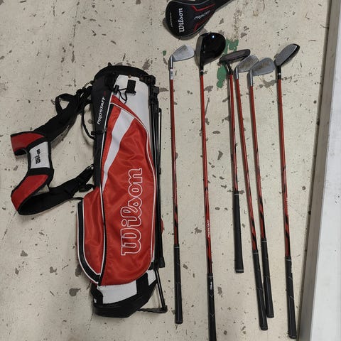 Kohtuullisen kuntoinen Wilsonin golfsetti. Tässä kaikki, mitä alkuun tarvitsee lajia aloittaessa. Bägissä korjauspaikka yhdessä kohtaa. Bägi muuten tosi kevyt ja siisti.