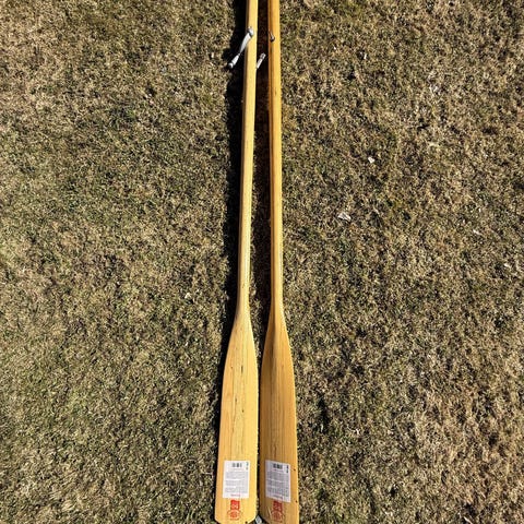 Puusoutuairot veneeseen. Materiaalina kerroksittain liimattu puu, luonnonvärinen lakattu pinta. Pituus 238cm. Muutaman kerran käytetty.
