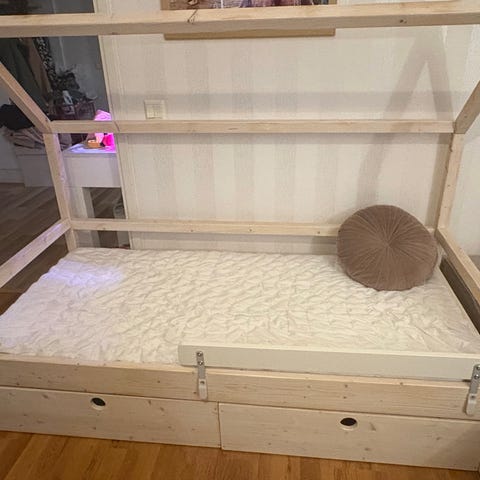 Myydään itse tehty, todella tuleva talosänky. Oikein hyväkuntoinen. Patja mukaan, joka siisti (päällä ollut aina vielä petauspatja). Mitat pituus 150cm, leveys 80cm, korkeus 140cm.
