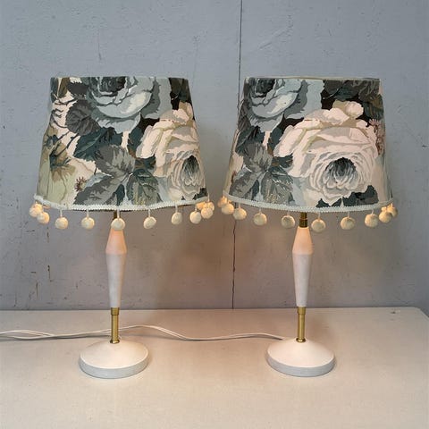 Jugend tyyliset vintage Precenta Oy:n pöytävalaisimet. Korkeus 34 cm. Kunto: huurrelaseissa vähän jälkiä, voi asettaa parhaan puolen esille. Toisessa valaisimen jalassa värikulumaa. Vanha pistoke. Päällenappi löytyy johdosta. Hinta siis kahdelle valaisimelle yhteensä. Toimivat.