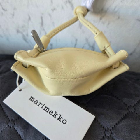 Ihana pieni Marimekko Karla Pocket pussukka mustaa nahkaa. Pussukassa vetoketju suljenta ja lyhyt hihna jossa metalliklipsi. Pussukan leveys 11 cm.