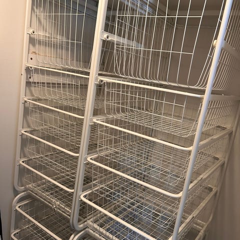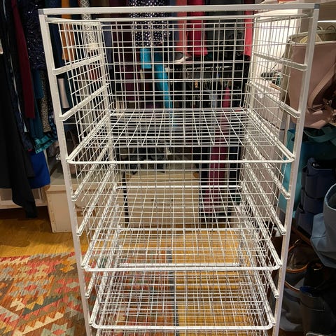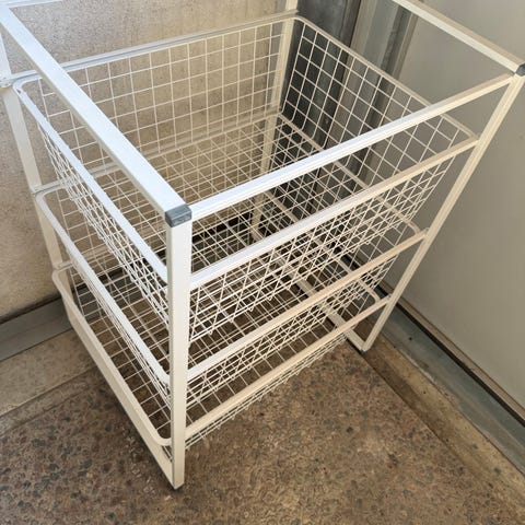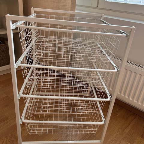Siisti, tukeva ja laadukas, hyvässä käytetyssä kunnossa. Sisältää harmaan kehikon ja 6 tasakokoista koria. Ulkomitat kehikon uloimmalta kohdalta mitattuna syvyys 53,5 cm, leveys 44 cm, korkeus 102,2cm.