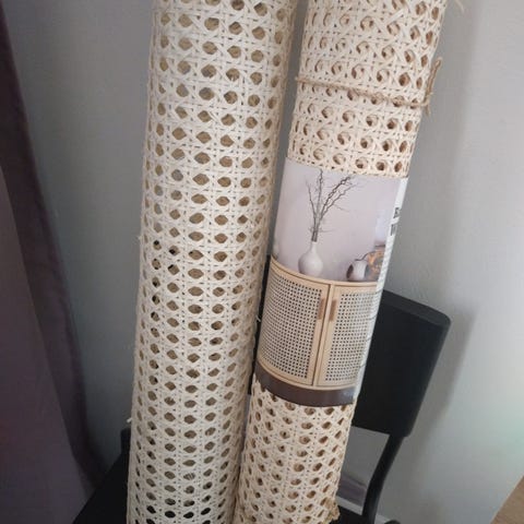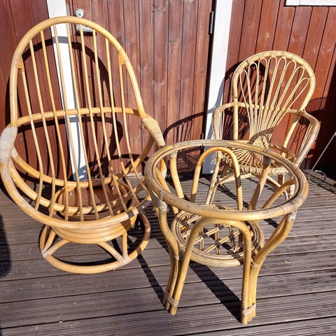 Rottinkinen sivupöytä, jossa yläosassa lasitaso ja alatasossa säleikköhylly. Pöytä soveltuu esimerkiksi kasveille, lehdille tai säilytykseen. Rakenne on kevyt ja avoin, ja materiaalina on punottu rottinki sekä lasi. Kuvissa näkyy kulumaa rungossa.