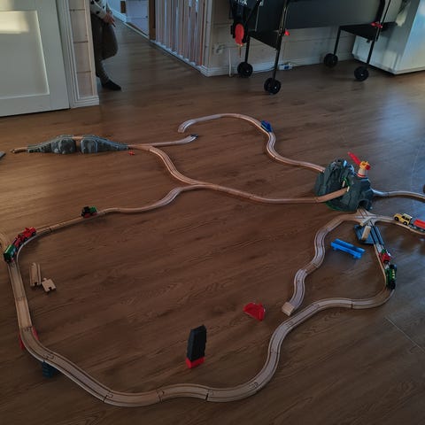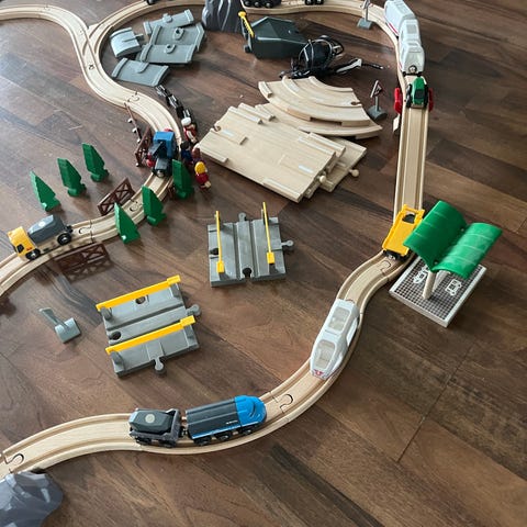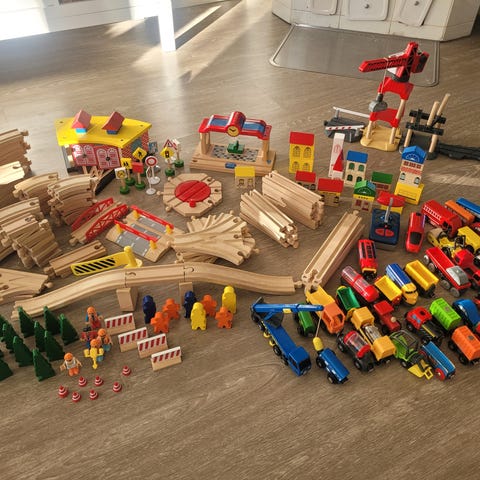 Puinen junanrata jossa mukana erilaisia nostureita yms. Kaksi pattereilla toimivaa veturia ja erilaisia junan vaunuja ja ajoneuvoja. Radan voi rakentaa kolmella eri mallilla, joista ohje mukana. Radan kanssa sopivat. yleisimmät puujunanradat.