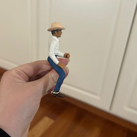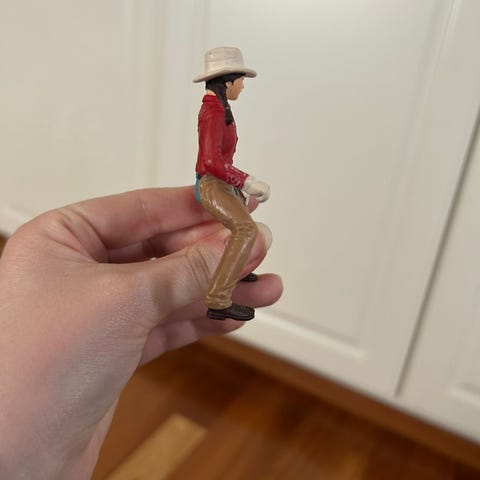 Schleich hahmo istuva mies. Pieni muovinen leikkihahmo, jolla on oranssi liivi, vaaleansininen paita, tummat housut ja oranssit kengät. Hahmo on istuma-asennossa ja sopii esimerkiksi Schleich-ajoneuvoihin, hevostalleihin tai muihin leikkeihin mittakaavaltaan vastaavien figuurien kanssa.