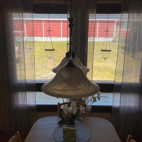 Hienokuntoinen kattovalaisin, messinkiä ja lasia.