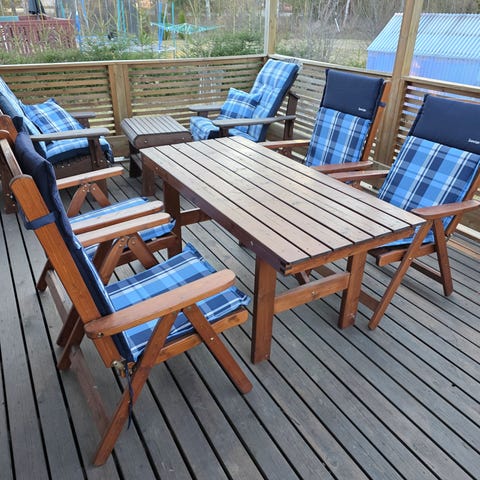 Jykevät puutarhatuolit (2kpl), pehmusteet ja pöytä (60x50)