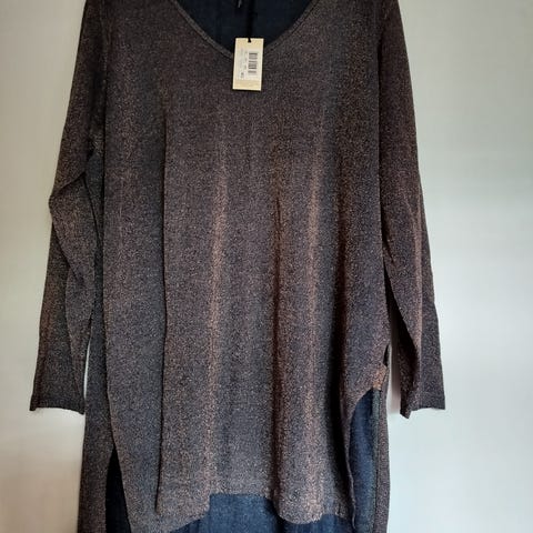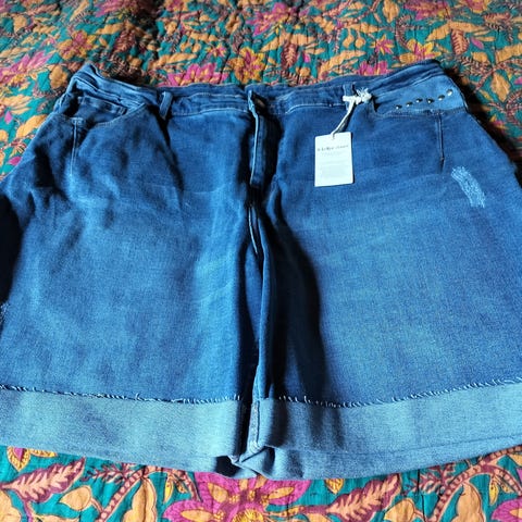 Myydään uudenveroiset farkku caprit. Koko 52. Vyötäröllä resori, joustaa reilusti. Vyötärö leveys 49cm, pituus 77.5cm, haara-lahje 47cm.