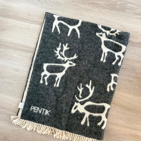 Pentikin Saaga villatorkkupeitto. Väri musta/tummanharmaa ja toinen puoli valkoinen. Koko 130*170.